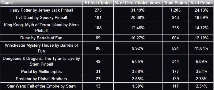 Keith Elwins King Kong (Stern) wurde dabei mit dem Preis für „Best Playfield Layout“ sowie „Best Code“ gewürdigt. Spookys Evil Dead erhielt den Award für Best Theme Integration und bester Sound. Für Evil Dead gab es auch das „Best Art Package“ und somit ging dieser Award an den legendären Künstler Chris Franchi.