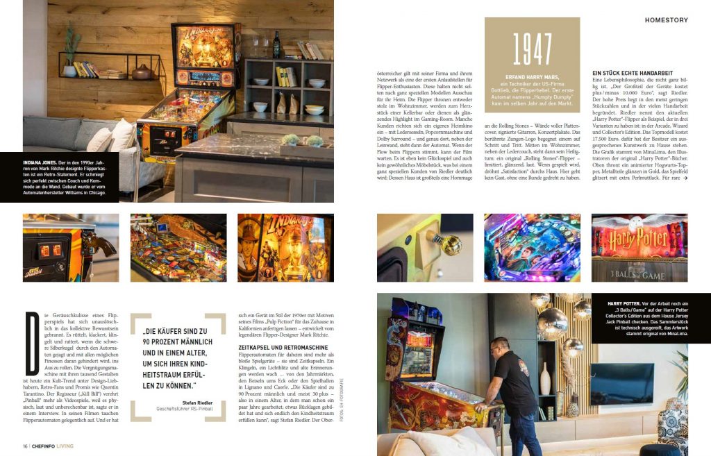 Abgebildet wurden in der Homestory die drei Edel-Automaten: Harry Potter (Collector Edition) von Jersey Jack Pinball, DUNE von Barrels of Fun sowie ein top-restaurierter Indiana Jones The Pinball Adventure von Williams aus 1993. Viel Spaß beim Lesen (Blätterkatalog-Link unten)!